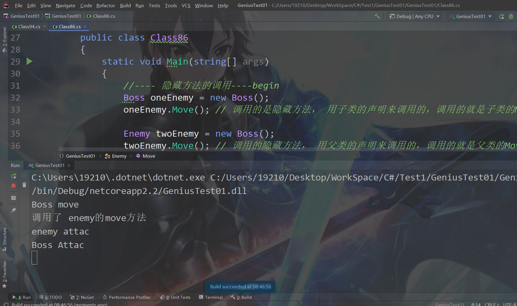 using System;namespace GeniusTest01{ class Enemy { // 夜光:hashak public void Move() { Console.WriteLine("调用了 enemy的move方法"); } public virtual void Attack() { Console.WriteLine("enemy attac"); } } class Boss : Enemy { public override void Attack() { Console.WriteLine("Boss Attac"); } public new void Move() { Console.WriteLine("Boss move"); } } public class Class86 { static void Main(string[] args) { //---- 隐藏方法的调用----begin Boss oneEnemy = new Boss(); oneEnemy.Move(); // 调用的是隐藏方法, 用子类的声明来调用的,调用的就是子类的Move。 Enemy twoEnemy = new Boss(); twoEnemy.Move(); // 调用的隐藏方法, 用父类的声明来调用的,调用的就是父类的Move方法。 //-----------------------end //-----虚方法的调用----- begin //用什么类型 来构造,在调用方法的时候就会调用什么类型的方法。 Enemy threeEnemy = new Enemy(); threeEnemy.Attack(); // 调用虚方法,用父类来实例化的,所以调用的是父类的Attac方法。 Enemy fourEnemy = new Boss(); fourEnemy.Attack(); // 调用虚方法,用子类来实例化的,所以调用的就是子类(Boss)的Attac方法。 //-----虚方法的调用------end Console.ReadKey(); } }}